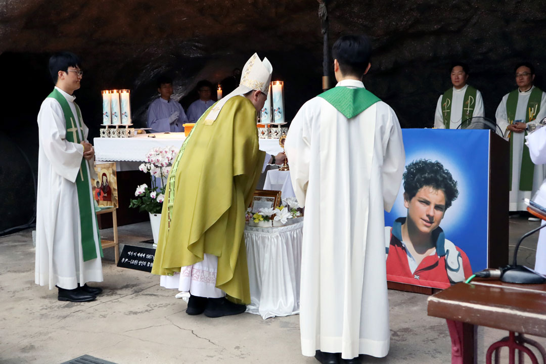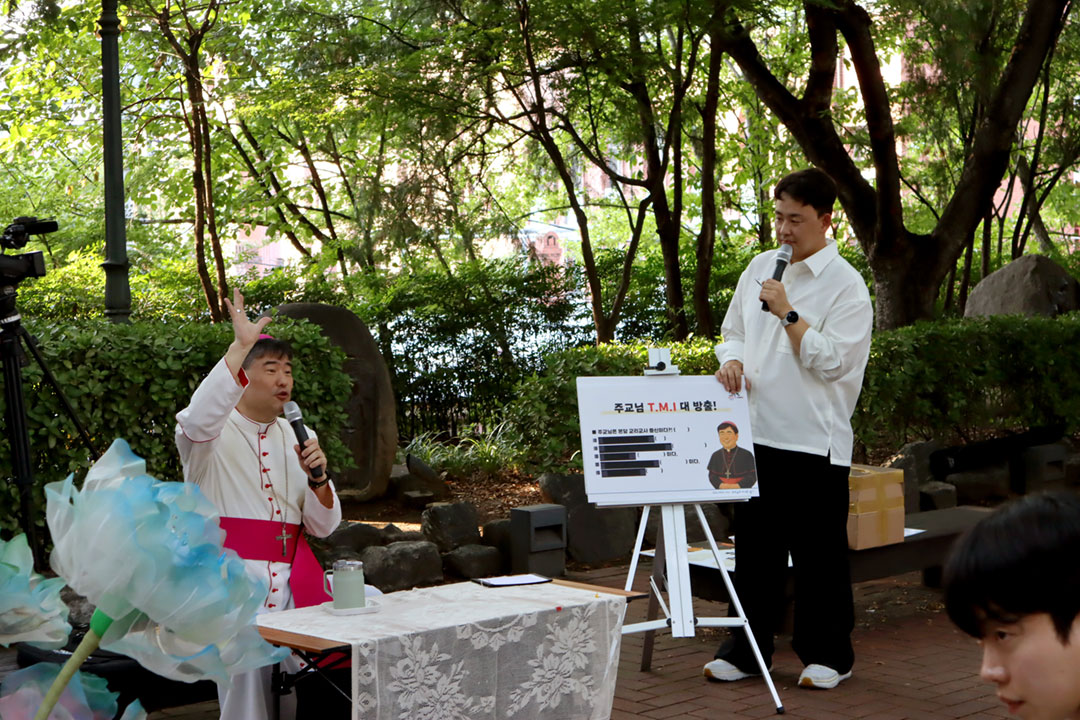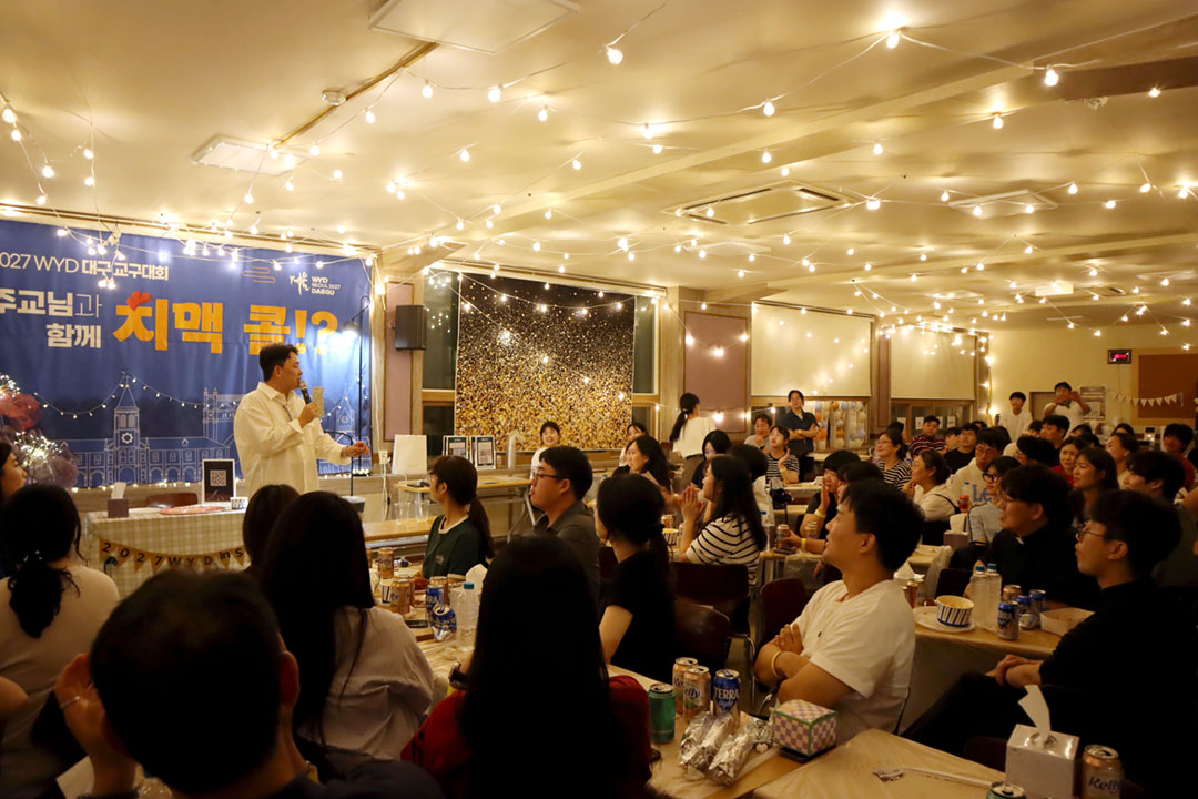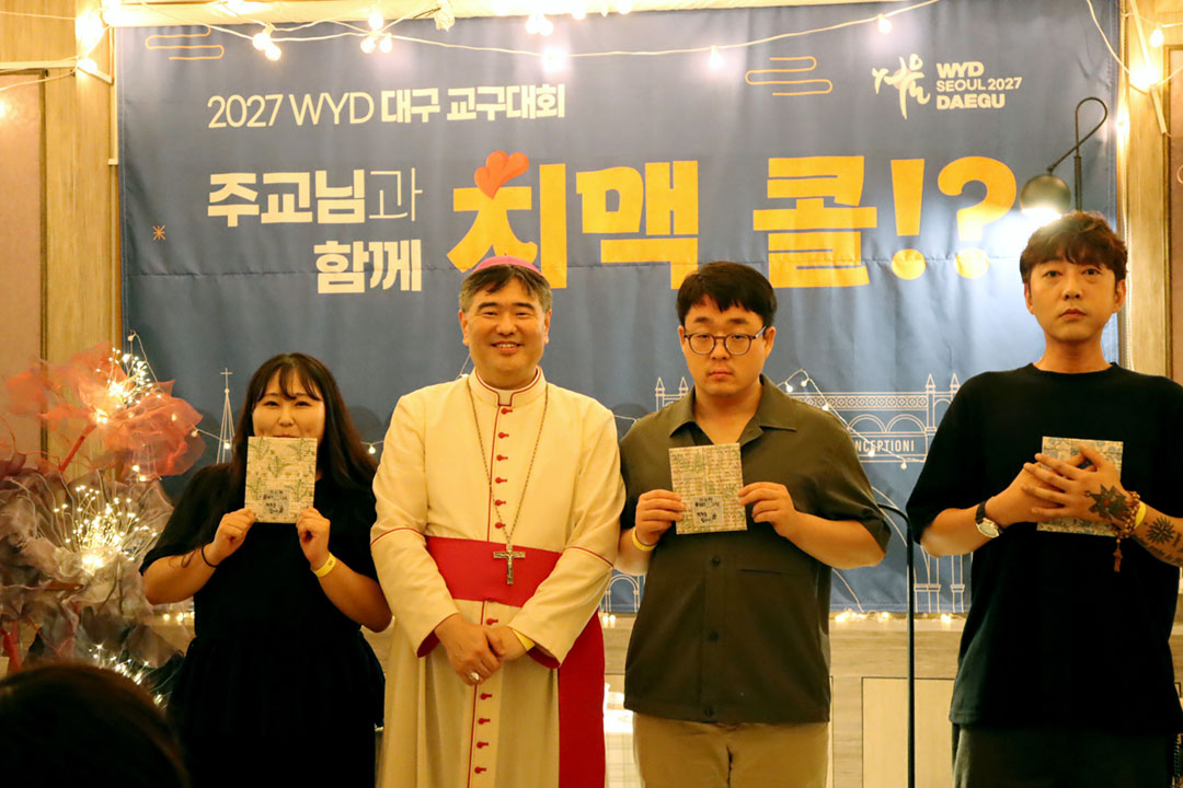 2027 세계청년대회 대구교구대회 조직위원회(사무국장 : 문창규 베드로 신부)는 9월 6일(토) 오후 4시부터 성모당 일대에서 ‘주교님과 치맥 콜!?’을 개최했다. 이날 행사는 2027 세계청년대회 주제 성구인 “용기를 내어라, 내가 세상을 이겼다”(요한 16,33)와 연계해 대구교구대회의 모토인 “그리스도와 함께-기쁨과 희망”을 주제로 선착순으로 신청한 약 200여 명의 교구 청년이 교구 총대리 장신호(요한보스코) 주교와 신앙과 삶을 나누는 시간으로 마련됐다. 사전에 장 주교와 나누고 싶은 주제를 제출한 참가자들은 장 주교를 중심으로 둘러앉아 자유롭게 이야기를 나누고, 2027 세계청년대회 성공 개최를 위한 묵주기도와 미사, 고해성사, 그리고 치맥 파티를 즐겼다. 특히 미사 중에는 지난 7일 시성 된 성 카를로 아쿠티스의 유해 안치식도 거행됐다.