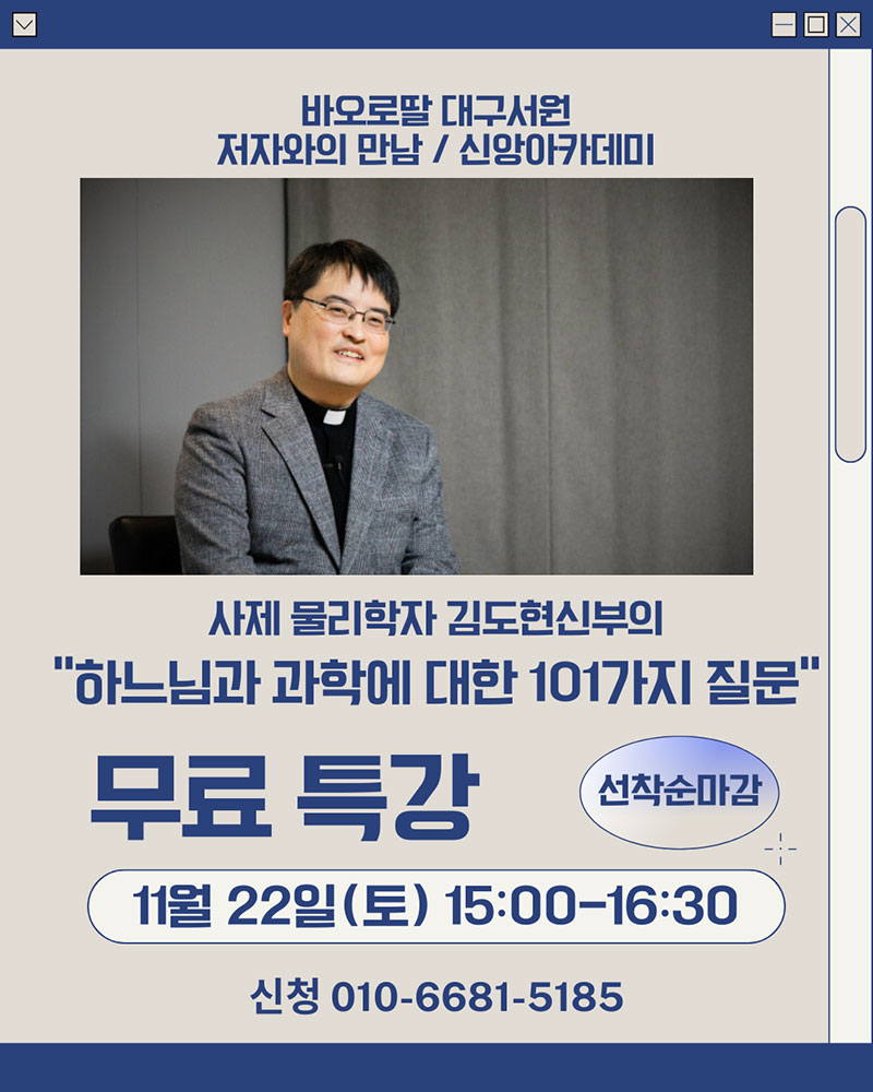 이 질문들에 오랜 시간 씨름하며, 물리학과 신학을 함께 탐구한 김도현 신부님께서 그 여정에 관한 이야기를 들려주십니다. 과학의 언어로 세상을 해석하면서도 그 너머의 ‘하느님의 현존’을 바라보는 사제학자의 깊은 시선안에서 ‘믿음과 이성의 조화’를 새롭게 발견하는 시간에 여러분을 초대합니다.