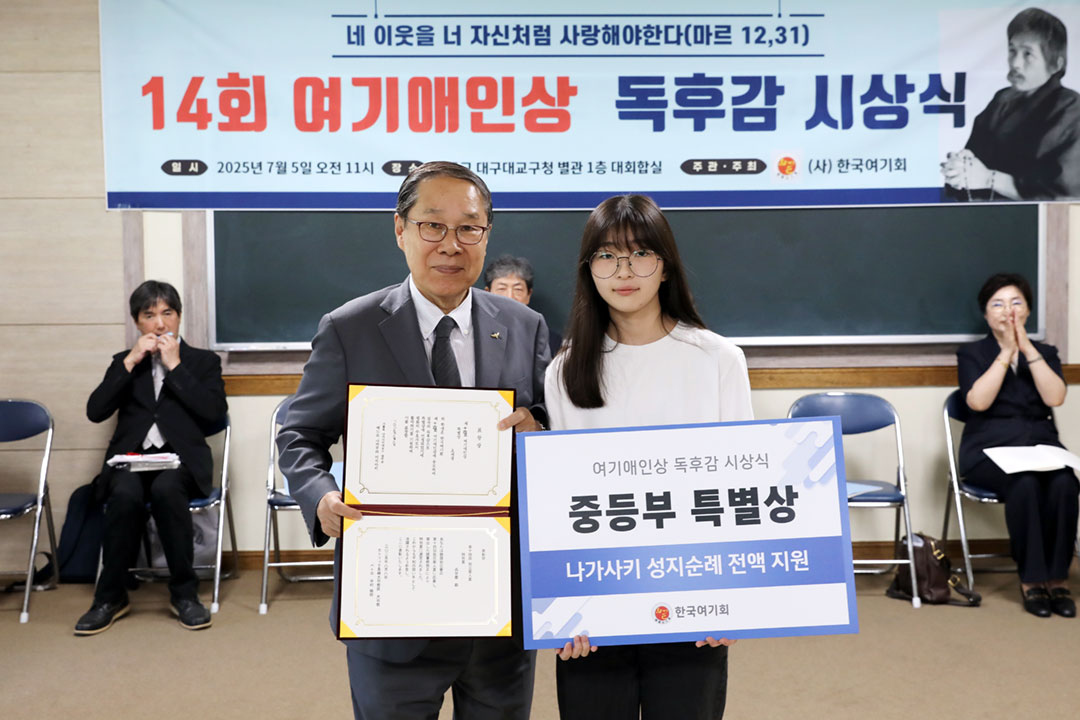 이날 시상식에는 한일국교정상화 60주년 기념 여기회 교류행사 참석차 대구를 방문한 일본여기회 도모나가 마사오 이사장(일본적십자사 나가사키원폭병원 명예원장), 일본여기회 나가이 도쿠사부로 부이사장(나가이 다카시 기념관 관장), 미야자키 요시노부 나가사키대교구장 비서가 함께한 가운데 심효준(대건고 1) 학생이 대상(한국여기회총재상)을, 오세경(산자연중 3) 학생이 특별상(나가사키대교구장상)을 받았고, 서기윤(대건고 1) 학생과 김지인(대건중 2) 학생이 최우수상(대구시교육감상)을 수상했다.
