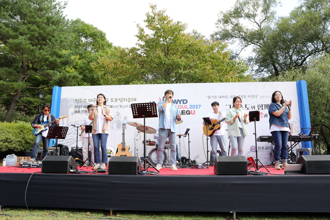 교구 내에서 참가한 1,000여 명의 신자들은 세 코스 중 하나를 선택해 자유롭게 순례하고, 오후 2시 교구장 조환길(타대오) 대주교의 주례로 순교자 현양 미사를 봉헌했다. 이날 행사에는 2027 서울 세계청년대회 홍보 부스 체험과 교구 청년 생활성가팀의 공연도 함께 마련됐다. |