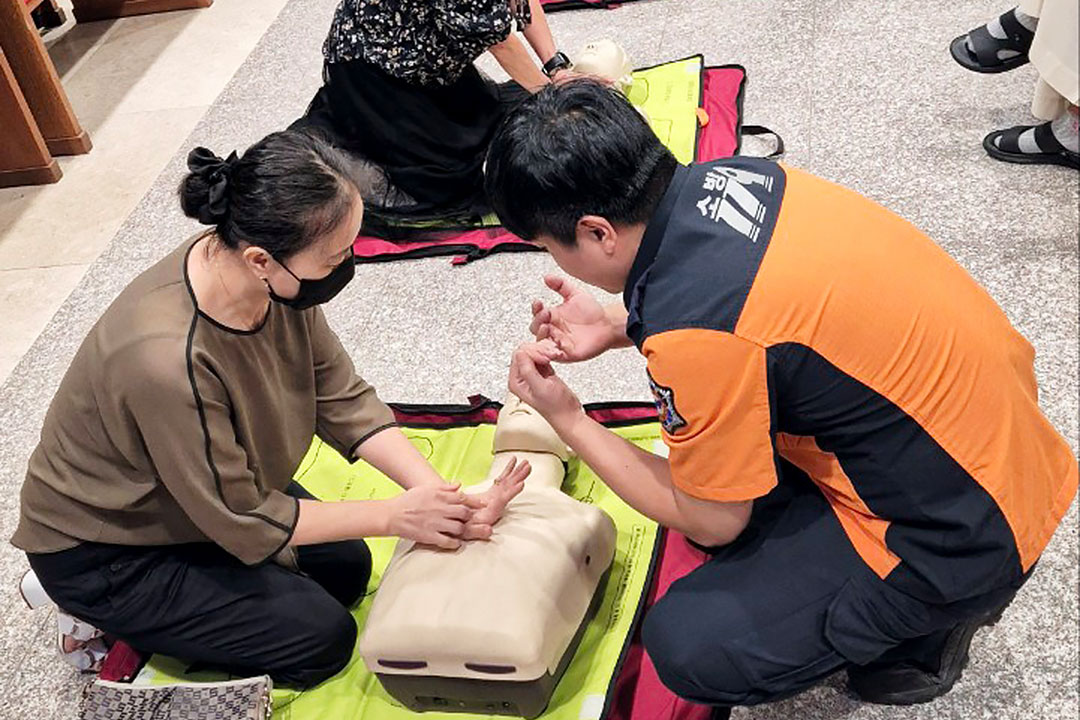 이날 교육은 강서소방서 응급재난 교육팀 정용현, 배효민 소방관의 강의에 이어 6개의 더미로 신자들이 직접 심폐소생술을 실습체험하며 만의 하나 일상 속에서 발생할 수 있는 응급상황에 대한 대응방법을 배웠다. 다사성당(주임 : 이성진 요아킴 신부)은 9월 20일(토) 오전미사 후, 선교위원회 주관으로 본당 전 신자를 대상으로 심폐소생 응급처치 및 위기상황 대응방법에 대한 안전교육을 실시했다.