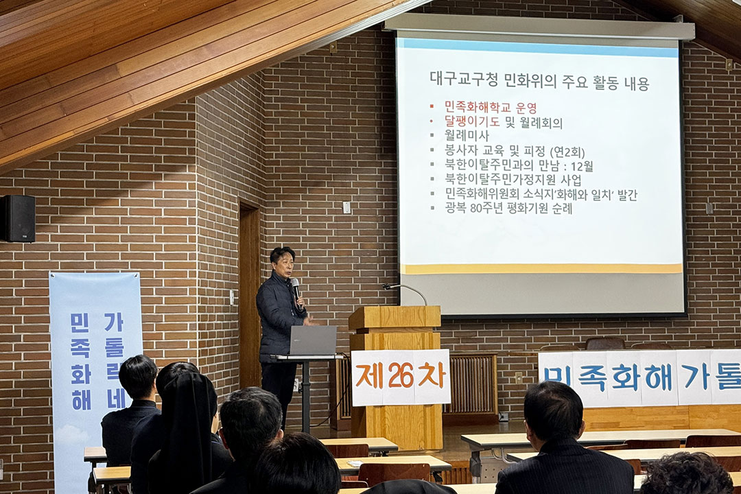 전국에서 사제 16명, 수도자 24명, 평신도 34명이 참가한 이번 일정에 대구대교구 민족화해위원회(위원장 : 이기수 비오 신부)에서는 16명이 함께 했다. 이들은 김수환 추기경의 평화 사상에 대한 주제 강의를 듣고 나눔을 했다. 그리고 민족화해위원회 특별위원인 교구장 조환길(타대오) 대주교의 주례로 파견미사를 봉헌했다. 제26차 민족화해 가톨릭네트워크가 11월 26일(수)부터 28일(금)까지 한티피정의 집에서 있었다.
