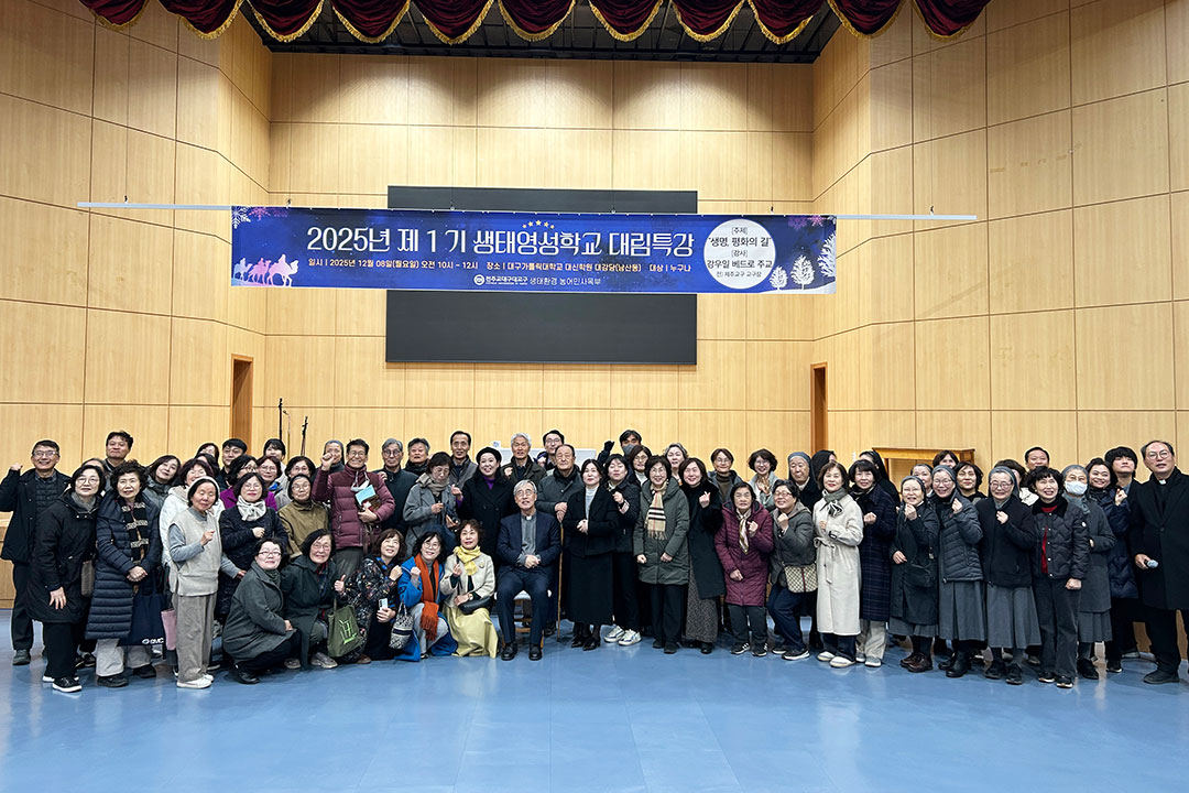 2025년 창조시기 생태영성학교 대림특강이 12월 8일(일) 오전 10시 30분 대구가톨릭대학교 대신학원 대강당에서 전 제주교구장 및 주교회의 생태환경위원회 의장을 역임한 강우일(베드로) 주교의 통합 생태론 관점에서 ‘생명·평화의 길’을 주제로 열렸다.