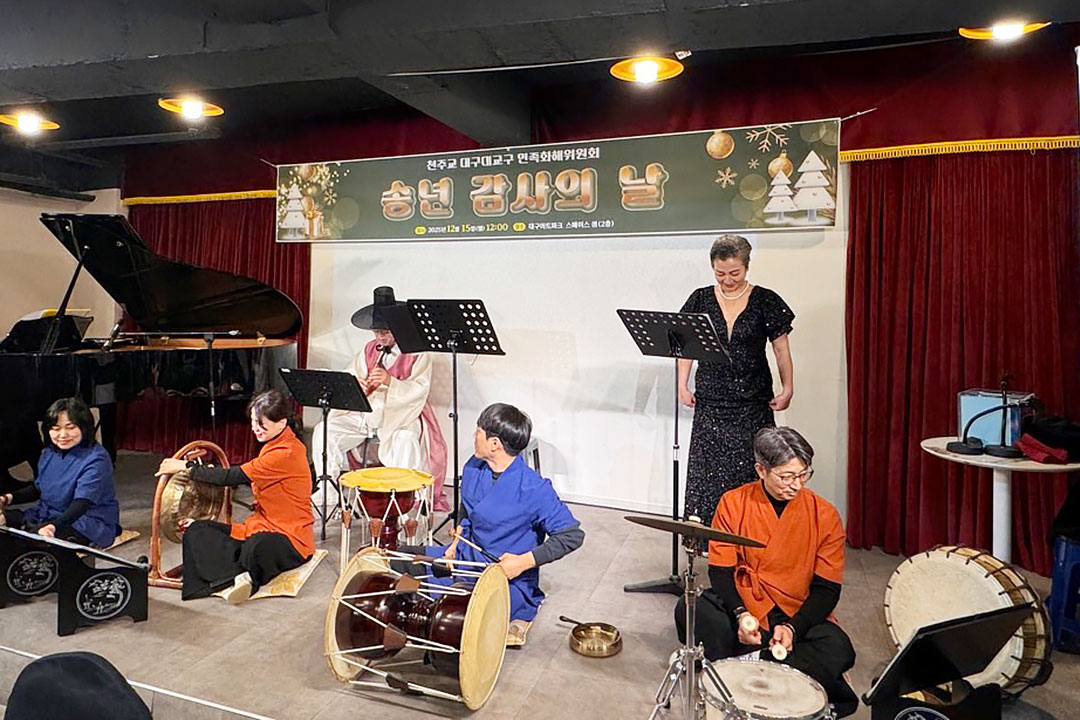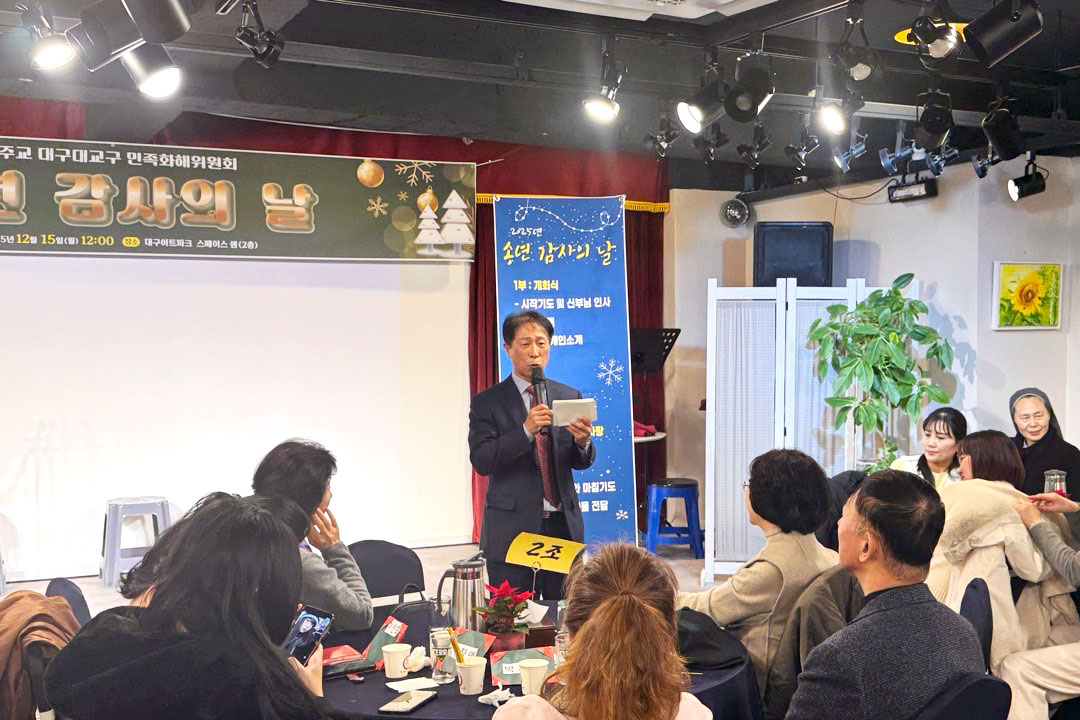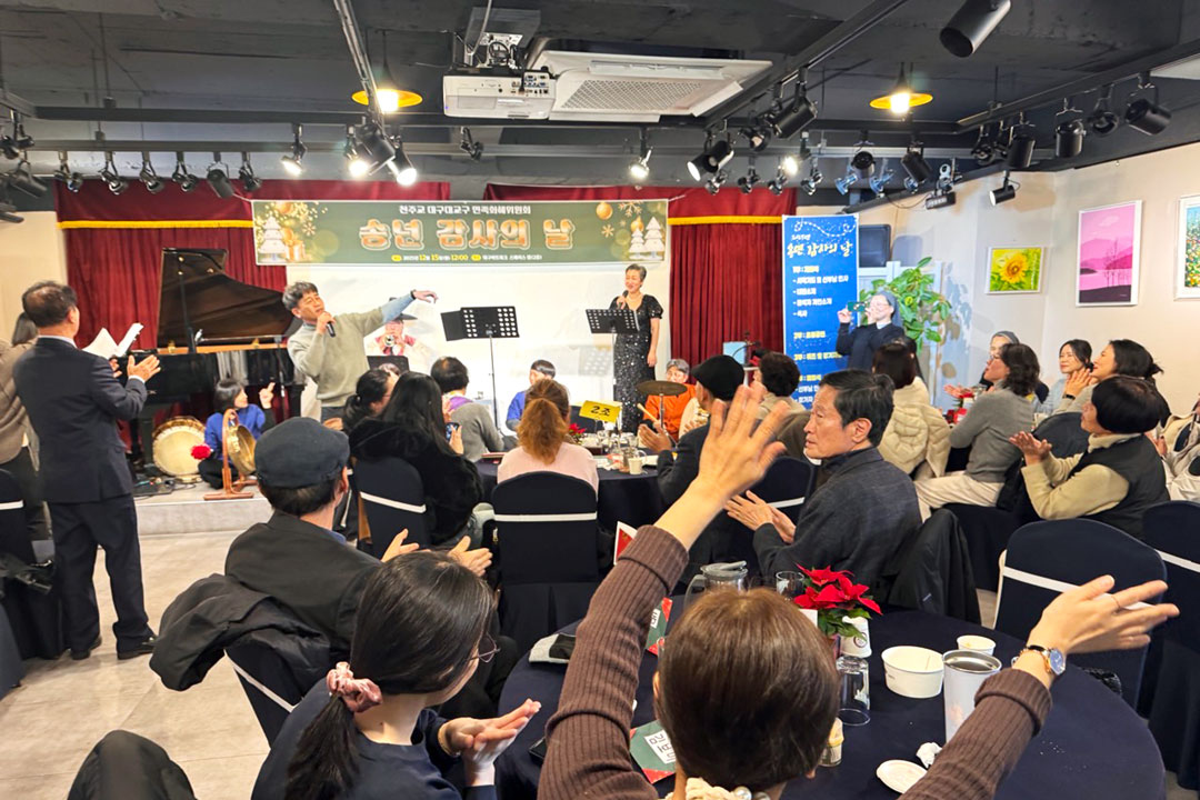 북향민 21명을 초대하고 봉사자 15명이 참석한 이날 송년회는 감사미사를 봉헌한 후 계산 풍물패의 국악 퓨전 공연, 레크리에이션 등으로 진행됐다. 민족화해위원회 박노윤(레오) 후원회 회장은 “오늘 송년회를 통해 북향민들을 환대하고 친교의 시간을 나누면서 봉사자로서 자긍심을 느낀다.”고 했다. 민족화해위원회(위원장 : 이기수 비오 신부)는 12월 15일(월) 낮 12시 대구아트파크에서 ‘2025년 북향민과 함께하는 송년회’를 마련했다.
